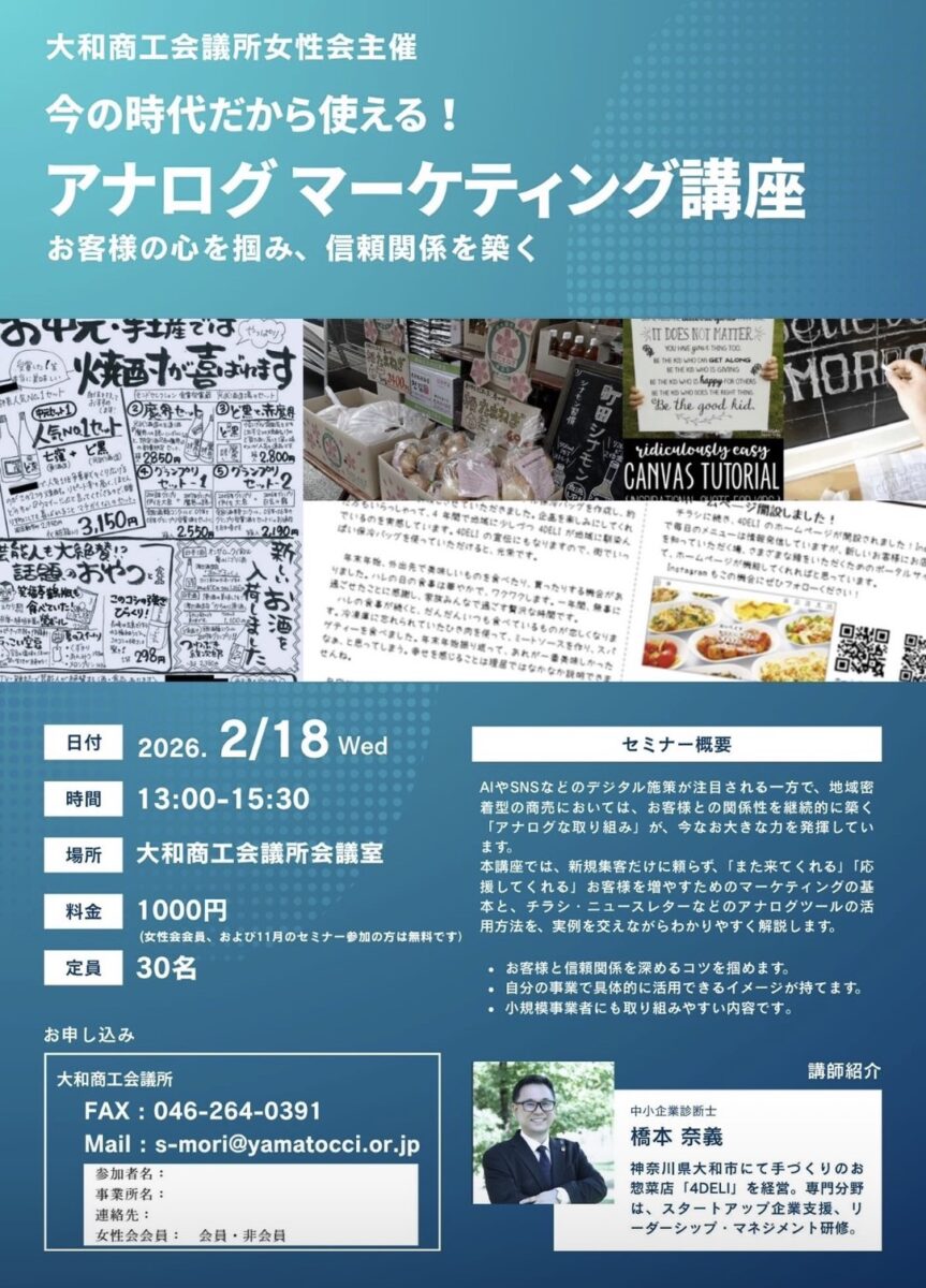 先日、大和商工会議所で開催された「アナログマーケティング講座」で、カメラマンをつとめさせていただきました!